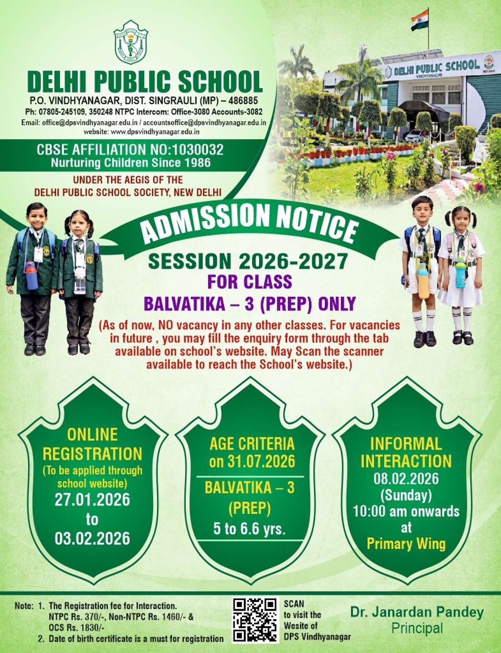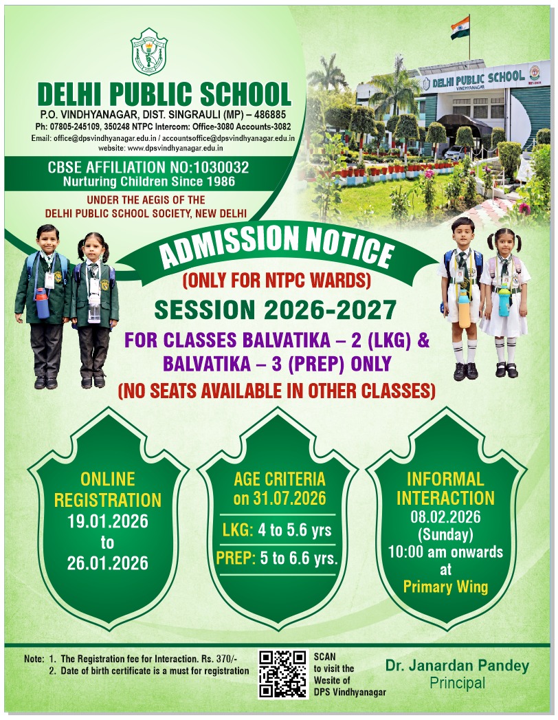 DPS Society, New Delhi established DPS Vindhyanagar on 7th August 1986 in the township of NTPC Vindhyachal. DPS Society & NTPC Vindhyachal entered into an agreement that NTPC Vindhyachal will provide infrastructural support on nominal rental basis and in return DPS Society will provide quality education to the wards of NTPC Vindhyachal on half of the normal Tution fee. The school was instituted on 7th August, 1986 and now it has earmarked excellence for itself in all fronts - Sports, Cultural Activity and Scholastic Achievements, Professional and competitive examinations. Not to adhere only to the elite, DPS Vindhyanagar caters Quality Education to the underprivileged and unreached sect of the society.